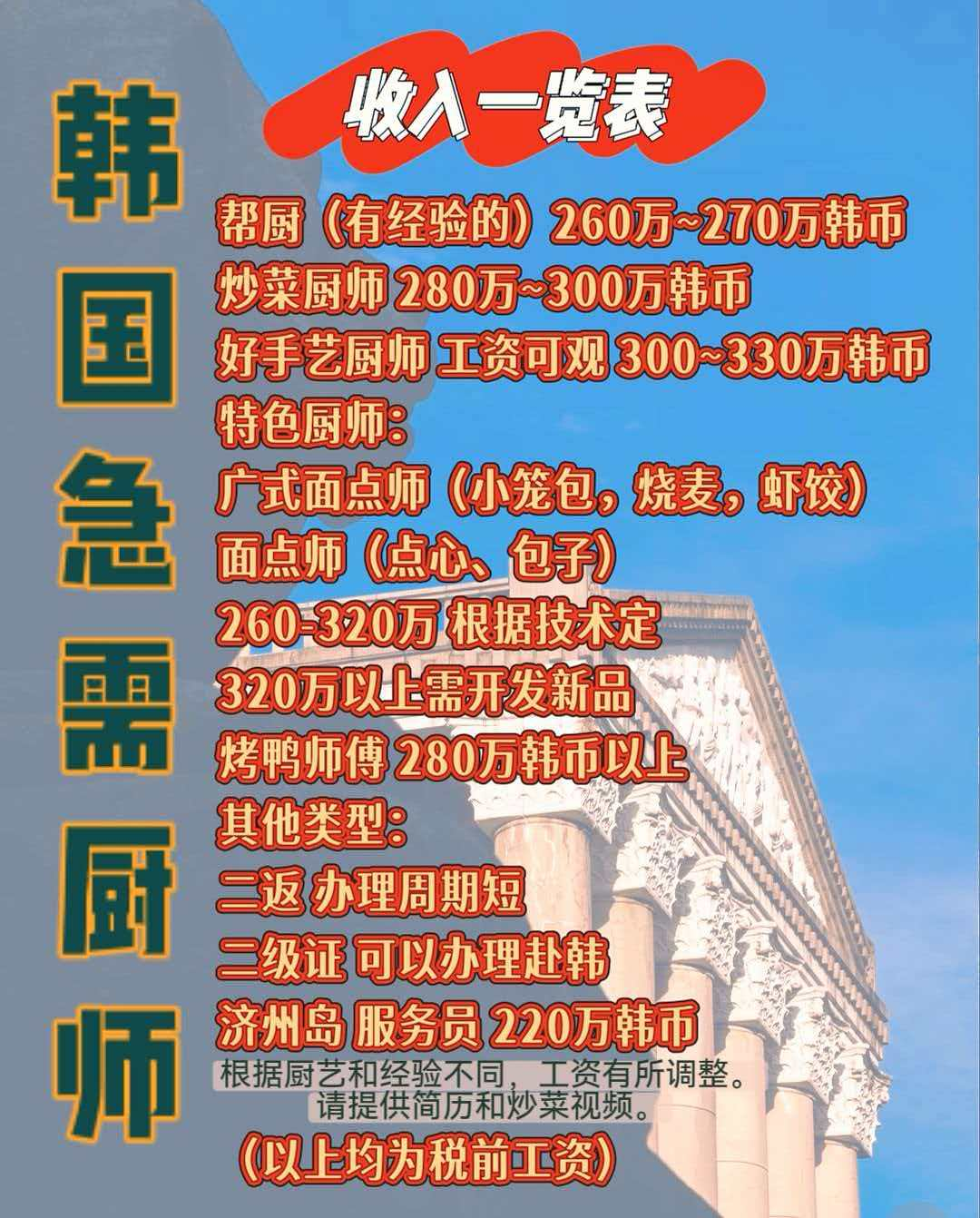 據韓國最新招聘信息顯示,各類廚師崗位薪資十分可觀:
